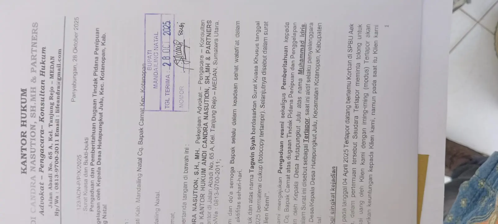 Kuasa hukum juga mengonfirmasi telah menyerahkan bukti-bukti pendukung berupa surat kuasa, somasi, kwitansi penerimaan uang, dan surat tanda penerimaan laporan (STPL) kepada Bupati dan Camat Kotanopan.