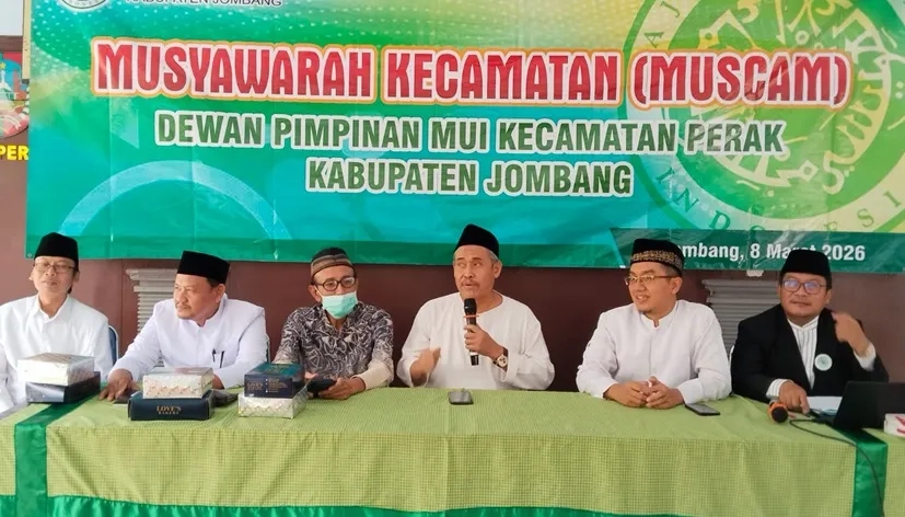 JOMBANG Garudasatunews.id – Musyawarah Kecamatan (Muscam) Majelis Ulama Indonesia (MUI) Kecamatan Perak, Kabupaten Jombang, menetapkan KH M. Haris Munawir sebagai Ketua Dewan Pimpinan MUI Perak untuk periode 2026–2031. Penetapan tersebut dilakukan melalui forum musyawarah yang digelar di Pendopo Kecamatan Perak, Minggu (8/3/2026).