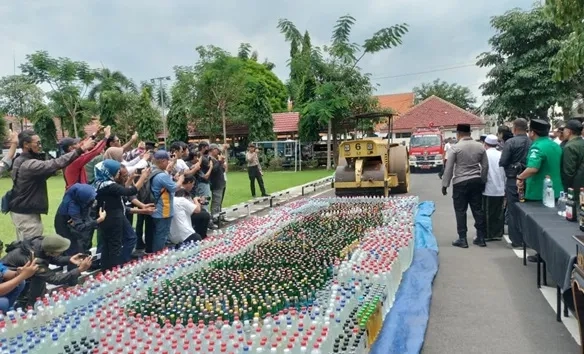 Sebanyak 7.310 botol miras merupakan hasil sitaan periode Januari–Februari 2026, ditambah 5.000 botol dari operasi akhir tahun 2025. Ribuan botol berbagai jenis dan merek itu digilas menggunakan alat berat hingga hancur.