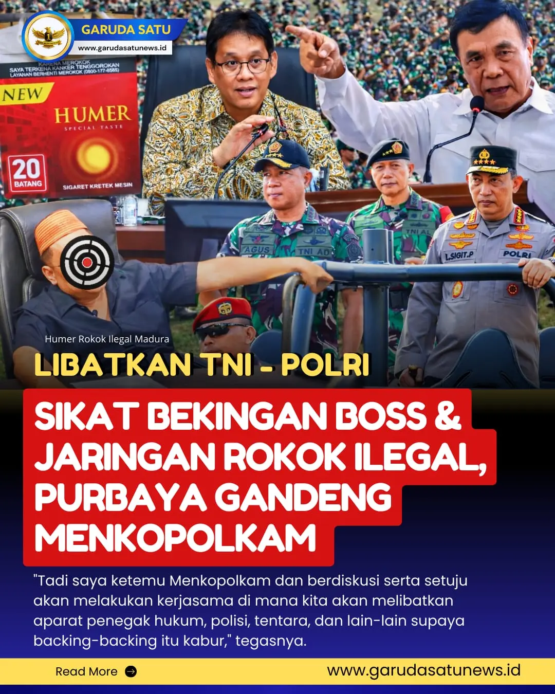 Jakarta,garudasatunews.id  – Menteri Keuangan Purbaya Yudhi Sadewa menggandeng Menteri Koordinator Bidang Politik dan Keamanan Djamari Chaniago untuk melawan bekingan para produsen dan pengedar rokok ilegal.