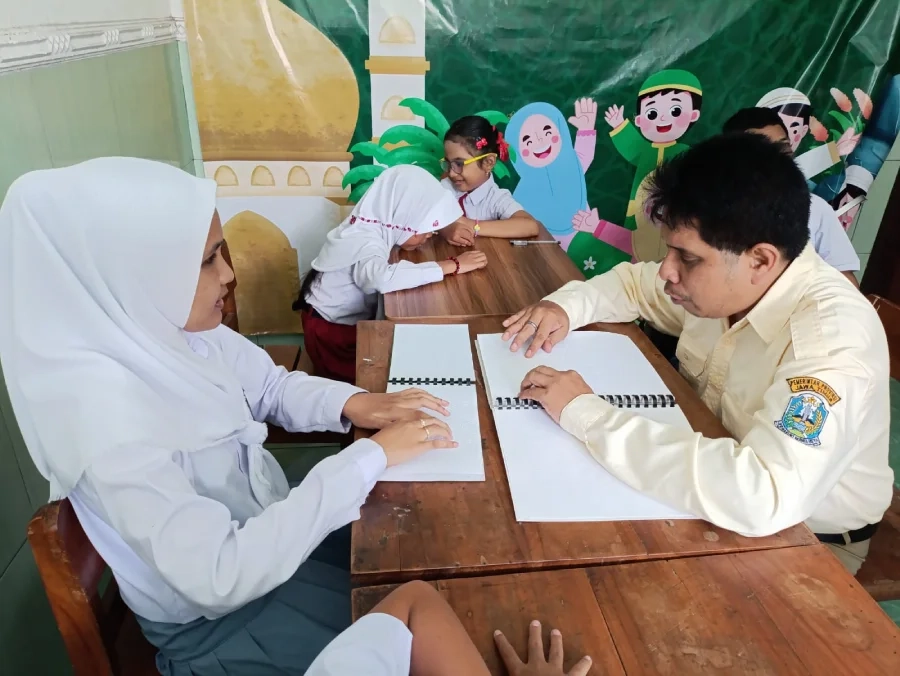 Salah satu siswa tunanetra, Riska Desila Putri, terlihat tekun membaca Al-Qur’an braille dengan meraba setiap baris huruf menggunakan jemarinya. Sentuhan menjadi pengganti penglihatan dalam memahami ayat-ayat suci yang dibacanya.